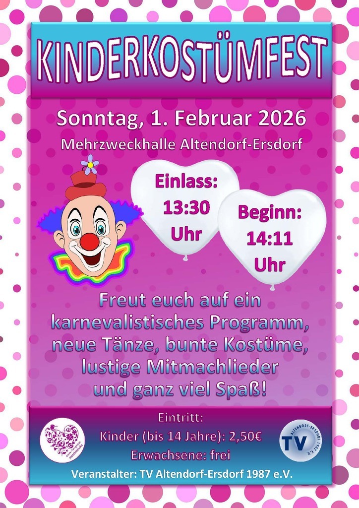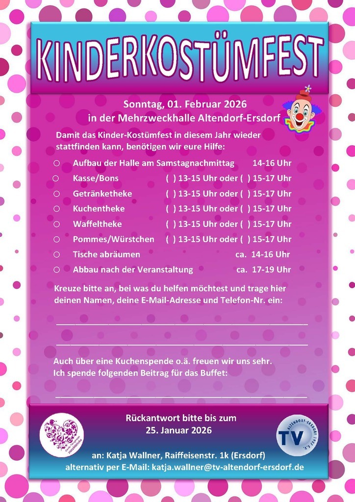 Für das Kinderkostümfest benötigen wir tatkräftige Hilfe. Auf dem Helferzettel dürft ihr gerne ankreuzen womit ihr unser Fest unterstützen wollt. Rückantwort bitte bis zum 25. Januar 2026 an: Katja Wallner, Raiffeisenstr. 1k (Ersdorf) alternativ per E-Mail: katja.wallner@tv-altendorf-ersdorf.de